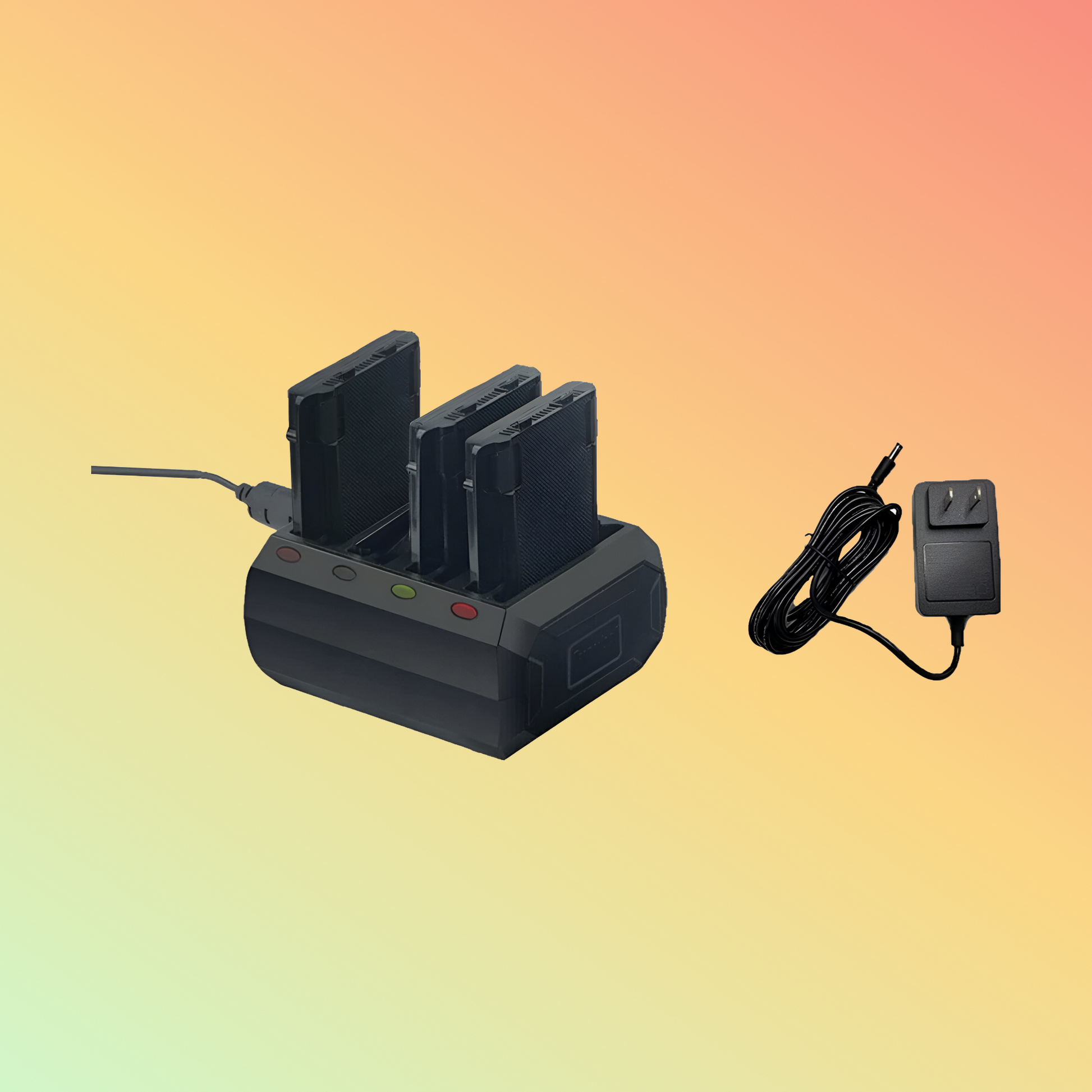 The package includes the 4-Slot Charger Cradle and the required power supply.